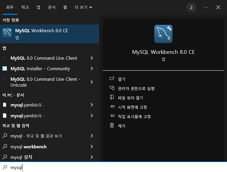 윈도우 검색창에 mysql을 검색하여 MySQL Workbench 8.0 CE를 실행해준다.