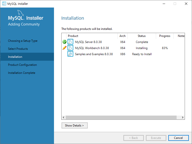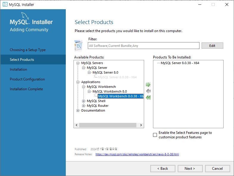 순서대로 들어간 다음 MySQL Server 8.0.38 - X64을 선택하고 오른쪽 화살표를 눌러준다.
